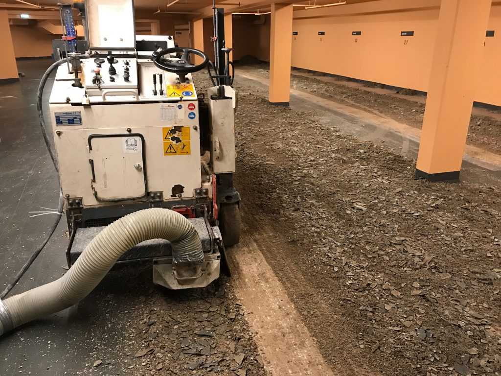 Fräsen – unverzichtbar bei sanierungsbedürftigen Untergründen, beispielsweise bei abplatzendem Estrich, Fetten oder Beschädigungen. Das Verfahren beseitigt lose Schichten und schafft eine tragfähige Basis.